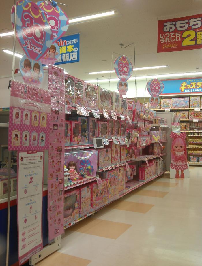 メルちゃんをあまり知らない方にもメルちゃんの魅力をわかってもらえる様に メルちゃんヒストリー等、説明付きのPOPを展示しています。 ディスプレイの中では30周年をお祝いするメルちゃんとその仲間達が パーティーをしています。 内装は全てスタッフが1から手作りした力作です。手作り感あふれる 温かいホームパーティーを演出しています。 30年ずっと変わらずに愛され続けるメルちゃんの可愛らしさを活かした、 にぎやかな売場です。 ぜひ皆様でお越しください。