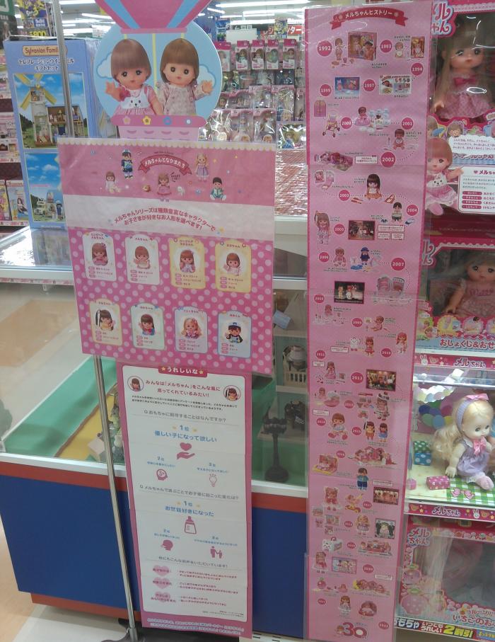 ディスプレイの中では30周年をお祝いするメルちゃんとその仲間達が