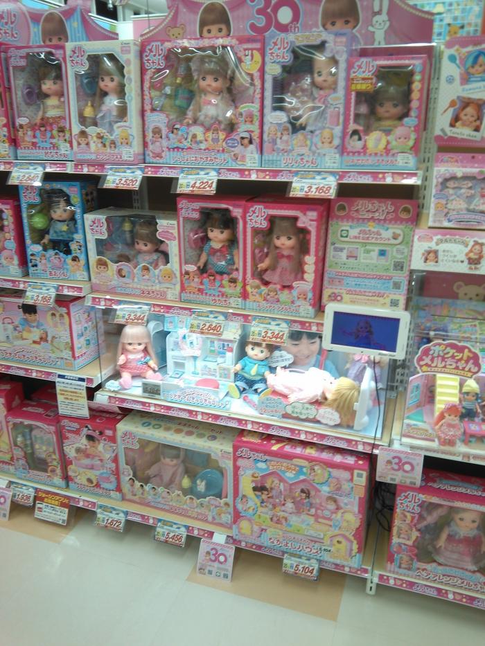 メルちゃんのコーナーがわかりやすいように通路側にPOP貼り付けてアピールしています。
