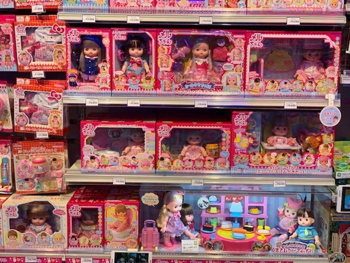 お人形や小物などたくさんメルちゃんグッツがいっぱい。