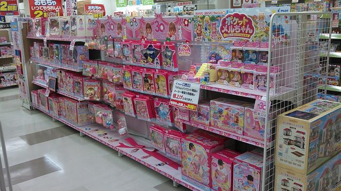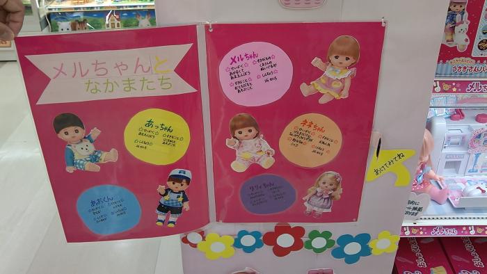 商品棚下部には 大きなピンクのリボンと一緒にメルちゃんたちと